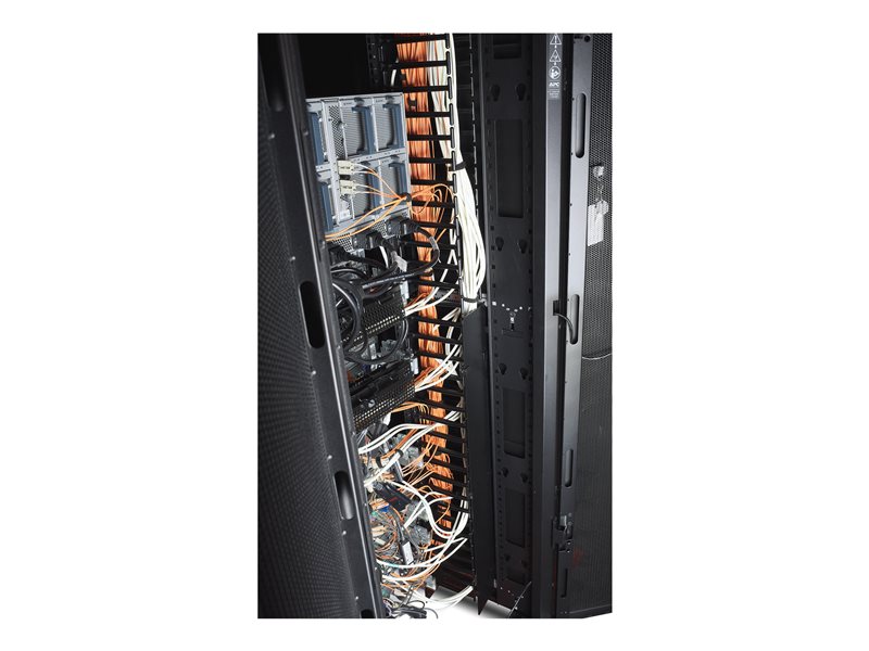 NetShelterĀ Cable Management provides a comprehensive selection of accessories to organize power or data cables within a server rack. This vertical cable manager for the NetShelter SX series 42U and 750mm Wide provides maximum U-space coverage. It supports 190 to 250 CAT 6A/CAT 6 data cables per section and 190 CAT 6A per channel section. Easily secure and access cabling with toolless mounting on the backplate for accessories and snap hinge cable retainers. The vertical channels have smooth plastic fingers at 1U increments to allow patch cords to enter and exit in an organized manner. Each kit covers one corner of the enclosure and includes mounting hardware, 6x cable retainers with snap hinges and top securing bracket.