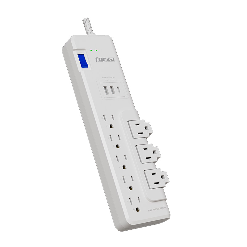Forza line of surge protectors is the reliable solution to guard all your appliances, electronic equipment and entertainment components from damage caused by electrical surges, lightning strikes and overloads. Our FSP-812RUSBCW features five standard outlets plus three rotating outlets designed to maximize the space by easily accommodating bulky plugs and adapters.